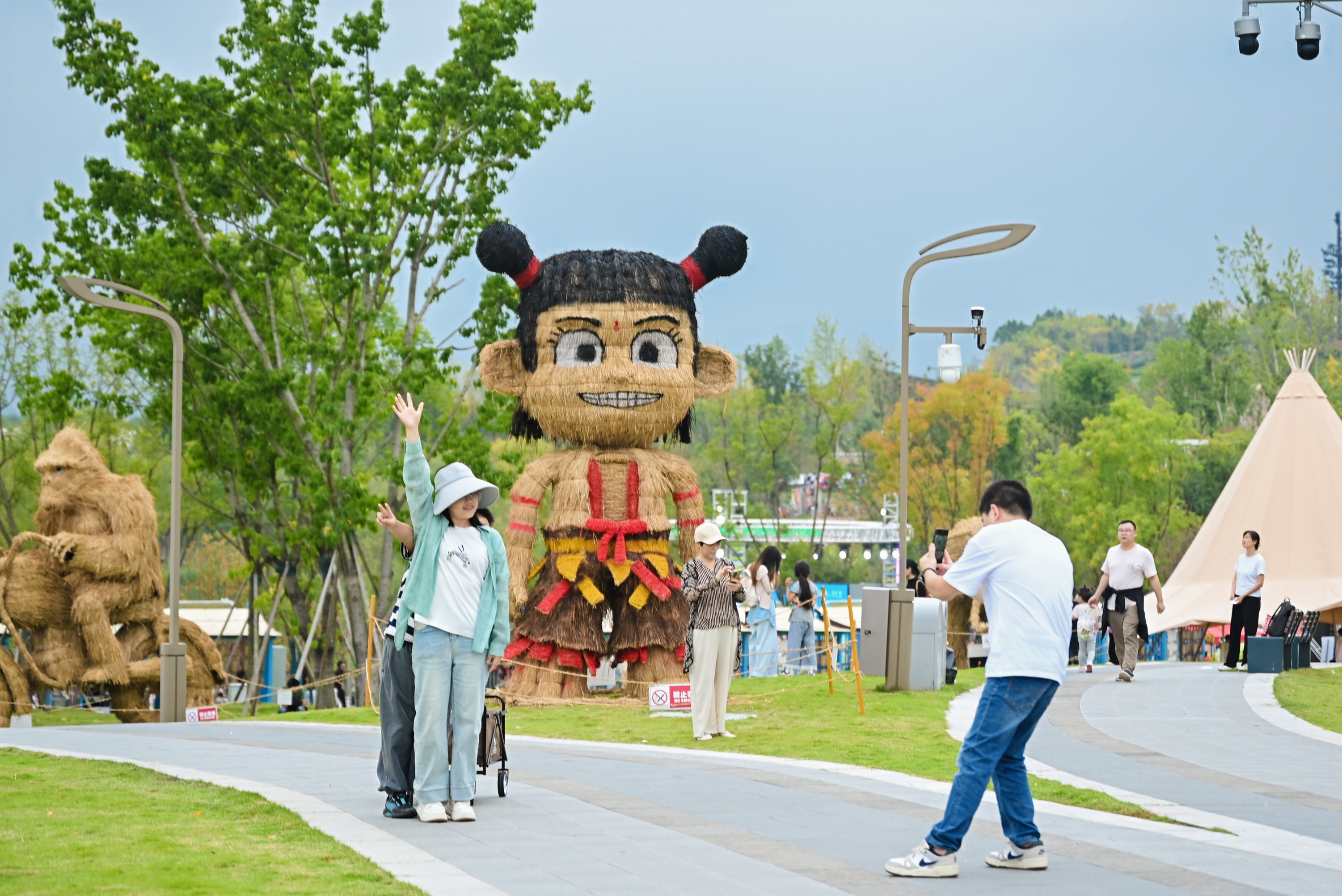 在成都世博园,备受期待的“稻草人艺术节”成为流量担当。作为全国最大规模的稻草艺术展,6大主题、50余组巨型稻草人装置,在国庆中秋期间成为游客拍照打卡的热门背景。
